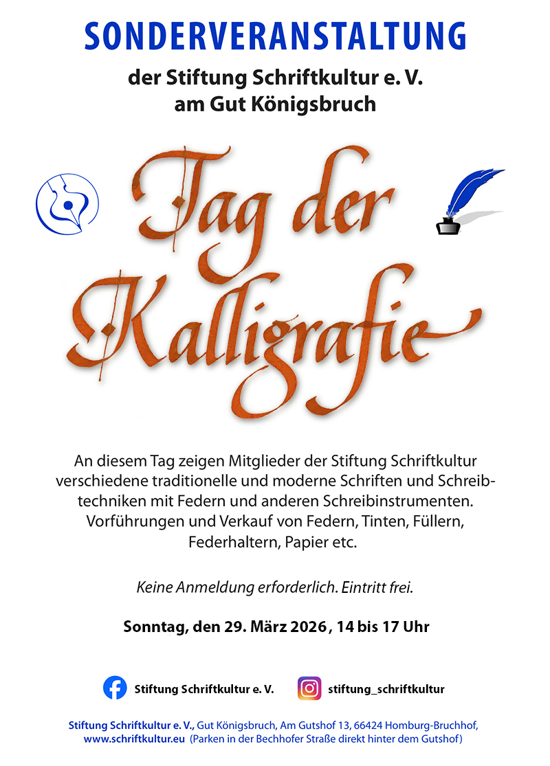 ? Tag der KalligrafieMitglieder der Stiftung Schriftkultur zeigen verschiedene traditionelle und moderne Schriften und Schreibtechniken: Vorführungen und Verkauf von Schreibmaterialien. Eintritt frei. Sonntag, 26. April 2026 , 10 bis 17 Uhr