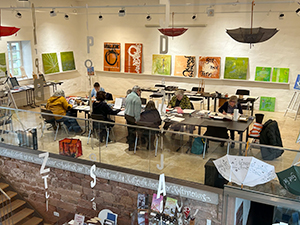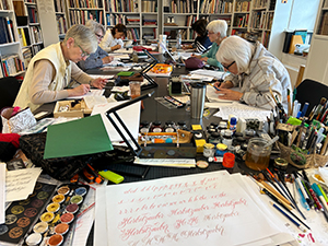 09.03.2025 Am gestrigen Samstag fand in der Galerie der Tageskurs "Feder, Tinte und Papier – Einstieg ins Schöne Schreiben" mit Ilse Spies statt. Bei herrlichem Sonnenschein lernten die Teilnehmerinnen und Telnehmer, mit Bandzug-, Redis- und Spitzfeder umzugehen und ihre Handschrift sowie einfache Alphabete ins rechte Licht zu rücken. Mit viel Elan zeigte die Kursleiterin eigene Beispiele, Karten und viele Möglichkeiten der Anwendung. Die jungen und junggebliebenen Teilnehmer waren nicht nur vom Kurs, sondern auch vom Ambiente unserer Räume begeistert. – Auch das offene Atelier findet seit Mitte Februar wieder in unserer Bibliothek statt. Derzeit wird fleißig englische Schreibschrift geübt. Beim letzten Mal wurden mit dieser schönen, eleganten Schrift kalligrafische Briefumschläge gestaltet. Dabei dienen nicht nur Umschläge von Jean Larcher als leuchtende Beispiele, sondern Katharina Pieper demonstriert auch verschiedene Möglichkeiten der Gestaltung und Anwendung. |