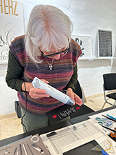 06.10.2025 Am gestrigen Tag der Kalligrafie führten Katharina Pieper, Brigitte Jenner, Michaela Rayer, Ilse Spies und Volker Köhl Kalligrafisches und Handwerkliches rund um die Schöne Schrift vor. Zahlreiche interessierte Besucher stellten Fragen und schauten uns über die Schulter. Es ergaben sich gute Gespräche und Kontakte. Namen in englischer Schreibschrift wurden geschrieben, Blätter in Bastarda vorgeführt. Karten und Lesezeichen hergestellt, zahlreiche Federtypen und Techniken des Schreibens gezeigt, Embossings erstellt, Namen auf Schreibwerkzeuge graviert und viele kalligrafische Werke gezeigt. Judith aus Saarbrücken und Irina aus Ingelheim, zwei begeisterte Mitglieder der Stiftung Schriftkultur, halfen beim Zählen der Besucher und warben mit viel Charme für unsere Bücher, Kataloge und die Kalligrafie. Schön war's! |