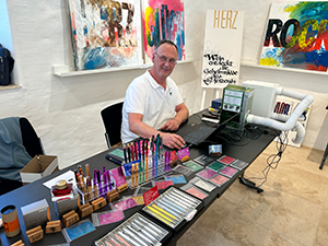 01.05.2023 Gestern am "Tag der Kalligrafie" besuchten uns viele Interessierte am künstlerischen Schreiben, um uns über die Schulter zu schauen und Neues zu sehen – den Tanz auf dem Papier! Brigitte Jenner präsentierte kleine und feine Original-Leporellos und Karten und zeigte den Besuchern das Schreiben verschiedener Schriften mit Gouache. Ilse Spies erklärte verschiedene Techniken, die Unziale und andere Schriften zu schreiben, erläuterte fachgerecht die Unterschiede und weckte Begeisterung bei den Besuchern. Volker Köhl (Pen Paradise) hatte wieder viele neue Schreibgeräte, Füller und Federhalter im Angebot, aber auch feine Papiere, Briefumschläge, Schreibblöcke und mehr. Katharina Pieper zeigte das Schreiben verschiedener Schriften und erklärte vieles zu Federn, Tinten und anderen kalligrafisch-künstlerischen Techniken. Alle freuten sich über die gelungene Veranstaltung! (Fotos: Wilfried Köhn) |